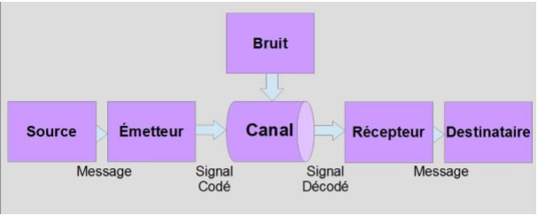 Dans cette figure, on voit qu’un message émis par une source d’information est transmis dans un canal bruité puis reçu par le destinataire. Si un tel schéma peut paraître naturel aujourd’hui, il était révolutionnaire à l’époque : pour la première fois, on y distingue clairement les rôles de la source, du canal et du destinataire ; de l’émetteur et du récepteur ; du signal et du bruit.