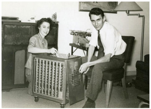 Figure 6 : Shannon devant sa machine à jouer aux échecs (coll. famille Shannon). Shannon se consacra toute sa vie à d’autres passions liées au jeu (échecs notamment) et à l’intelligence artificielle. Il publia en 1949 un des premiers articles sur la programmation du jeu d’échecs.