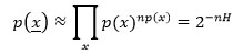 C’est ainsi que Shannon justifie l’utilisation de l’entropie, grâce au raisonnement suivant : considérons la source X = (X1,X2,...,Xn) pour une grande dimension n, où chaque symbole X peut prendre un nombre fini de valeurs. Supposons, pour simplifier, que cette source stationnaire est « sans mémoire », c’est-à-dire qu’à chaque instant, un symbole est tiré indépendamment des précédents. Les symboles X1,X2,...,Xn sont alors indépendants et identiquement distribués, et en notant p(x) la probabilité qu’un symbole égale x, la probabilité p(x) d’un message donné x = (x1,x2,...,xn) est le produit des probabilités individuelles : p(x) = p(x1)·p(x2)·········p(xn).