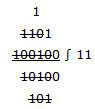 (8) La division en binaire, suivant le mode classique en usage (et non la division à la française utilisée par Leibniz), nécessite une certaine accommodation. La première division, 101101101 par 1010, ne pose pas de problème, puisqu’elle se fait comme en décimal : on trouve facilement le quotient 100100 et le reste 101. La division de ce quotient, 100100, par le diviseur 1010, est plus délicate (rappel : on ne fait intervenir que des 0 et des 1) : en 10010 il y va 1 fois 1010, reste 1000 – on abaisse un 0 (le dernier chiffre du dividende)– en 10000, il y va une fois 1010, reste 110. Cette deuxième division a donc bien 11 comme quotient et 110 comme reste.