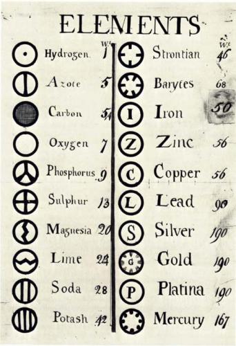 Figure 2 : Tableau d’éléments dressé par John Dalton (dans son livre mentionné ci-dessus “New system of chemical philosophy”, 1808). Au milieu de chacune des deux colonnes, le nom de l'élément (Lime, qui signifie chaux, représente le calcium, Soda le sodium, Potash le potassium); à gauche un symbole, et à droite le poids atomique tel que Dalton le déterminait à ce moment, et qu'Avogadro a rectifié, en s'approchant beaucoup des valeurs admises actuellement.