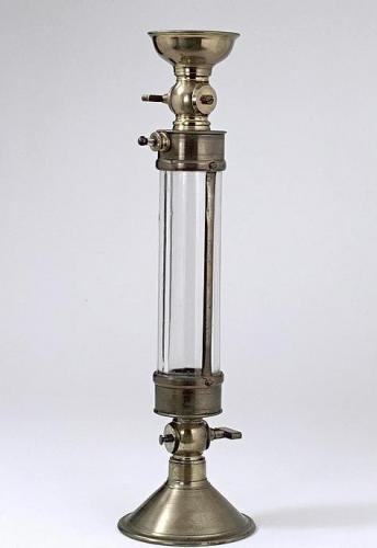 Figure 3 : Eudiomètre à eau utilisé par Gay-Lussac (cliché Bibliothèque de l’École polytechnique). L'eudiomètre est un instrument permettant de déterminer la proportion d'oxygène contenue dans l'air atmosphérique en le faisant réagir avec un excès d'hydrogène pour former de l'eau. L'appareil fonctionne posé sur une cuve remplie d'eau. L'air atmosphérique (ou le gaz analysé) est mélangé avec un excès d'hydrogène, et après combustion déclenchée par une étincelle, le volume d'oxygène contenu dans l'air est donné par le tiers de la diminution de volume du mélange gazeux accompagnant la réaction.