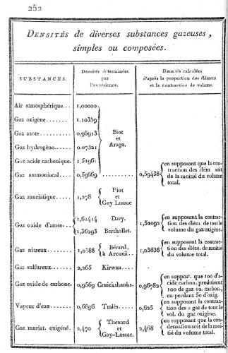 poids des éléments constituant une combinaison chimique gazeuse. Si par contre on considère deux combinaisons différentes formées des mêmes éléments (par exemple l'azote et l'oxygène) on retrouve des rapports simples entre leurs poids respectifs, comme on peut le constater dans le deuxième tableau de mesures (p.253 du mémoire).