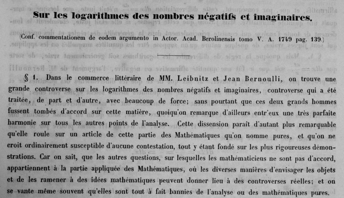 « De la controverse entre Mrs. Leibnitz & Bernoulli sur les logarithmes des nombres négatifs et imaginaires », Mémoires de l'Académie des sciences de Berlin 5, 1751, pp. 139-179