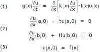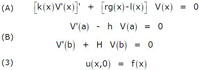 Fourier avait ainsi constitué une collection de cas, selon la géométrie du domaine. Considérer des matériaux non homogènes rend les calculs plus volumineux, mais on obtient les mêmes groupes d'équations, ayant les mêmes significations. Liouville, qui en cela ne fait encore que suivre Sturm, est donc conduit à examiner les équations (1), (2) et (3) traduisant respectivement l'évolution, les conditions aux limites (h et H sont des constantes), et la condition initiale