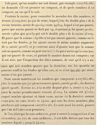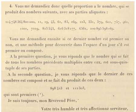 Vous me demandez si le nombre 100 895 598 169 est premier ou non, et une méthode pour découvrir, dans l’espace d’un jour, s’il est premier ou composé. À cette question, je réponds que ce nombre est composé et se fait du produit de ces deux : 898 423 et 112 303, qui sont premiers.