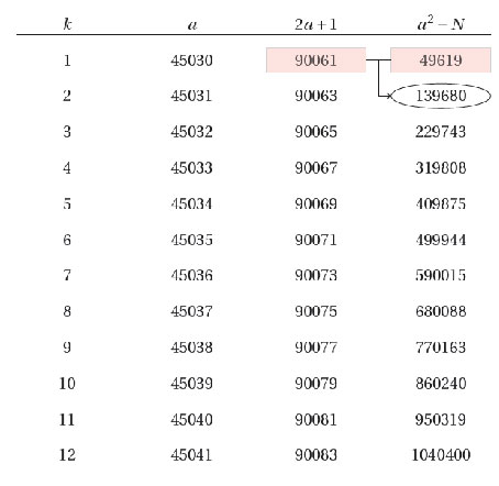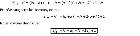 3. a² -N s’obtient en faisant la somme des deux cases situées au-dessus (à la manière du triangle de Pascal) et cela vient de la relation de récurrence que nous avons démontrée au paragraphe précédent. Il n’y a donc aucune multiplication à faire, ni aucun carré à calculer ! (à part pour la première ligne bien sûr – c’est-à-dire le calcul de a² -N).