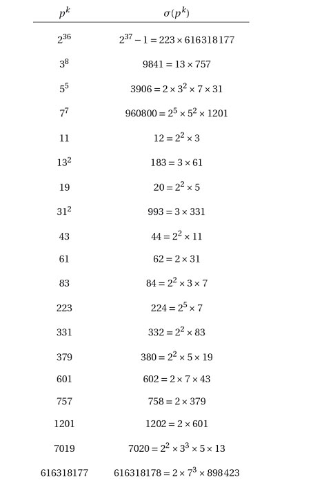 Savoir que ces facteurs sont premiers entre eux est important car on sait que la fonction σ est multiplicative, c’est-à-dire que σ(mn)=σ(m)σ(n) dès lors que m et n sont premiers entre eux. Pour calculer σ(N), il suffit donc de calculer les σ(pk) où pk parcourt tous les facteurs de N donnés au-dessus. Mais cela est aisé car on sait que si p est premier, on a la formule