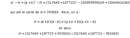 ). Si on est capable de trouver une décomposition en une différence de deux carrés, autrement dit si N=a²-b² alors,