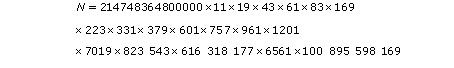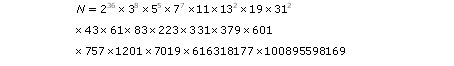 Hormis 100 895 598 169 dont on cherche la factorisation, tous les facteurs de cette décomposition de N sont des puissances de nombres premiers[4]. Tous ces facteurs sont donc premiers entre eux deux à deux et l’on peut supposer que les facteurs premiers de 100 895 598 169 sont distincts des autres facteurs premiers de N. Pour le voir rigoureusement, on peut faire successivement la division de 100 895 598 169 par 2, 3, 5, 7, ..., 7019 et 616 318 177 pour voir que le reste n’est jamais nul.