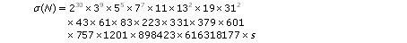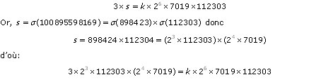 Le nombre noté σ(100895598169) ne peut pas être calculé pour le moment, donc on le notera s. On obtient la décomposition de σ(N) en faisant le produit de tous les nombres de la colonne de droite et, après regroupement des termes, on obtient :