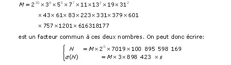 ce qui est bien entendu équivalent à σ (N)=6N. Nous allons calculer et voir comment, grâce à cela, Fermat a pu faire apparaître la factorisation de 100 895 598 169.