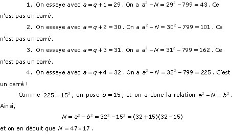 . Puisque l’idée est de trouver a et b tels que N=a²-b² et puisqu’on a vu (cf. le paragraphe précédent sur les conditions nécessaires) que si existe alorsa>q+1 , alors on va choisir successivement a=q+1, a=q+2 , a=q+3 , ... jusqu’à ce qu’il y ait un a tel que a²-N soit un carré. Facile, non ? Voici un exemple simple pour illustrer cette méthode : supposons qu’on souhaite factoriser N=799 . On a