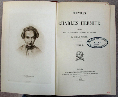 Figure 1 :Un portrait de Charles Hermite (1822-1901) jeune, sur l’édition de ses œuvres complètes. Ces œuvres ont été éditées sous l’auspice de l’Académie des sciences, de 1905 à 1917, par son gendre Émile Picard, mathématicien, secrétaire perpétuel de l’Académie (cliché Alain Juhel).
