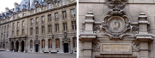 Figure 2 : Cour d’honneur de la Sorbonne (à gauche) et médaillon consacré à Charles Hermite, au-dessus d’une des portes (à droite). Hermite y fut titulaire de la chaire d’algèbre de 1871 à 1898 (cliché Alain Juhel).