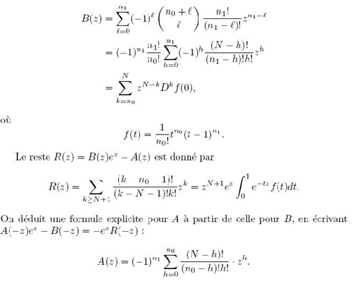 Le premier tour de force de Hermitte est de donner des formules explicites pour de tels polynômes, de contrôler les coefficients du point de vue arithmétique, et de contrôler le reste en valeur absolue. Le dénominateur B peut etre écrit de plusieurs manières (équivalentes) légèrement différentes avec N=n0+n1 :