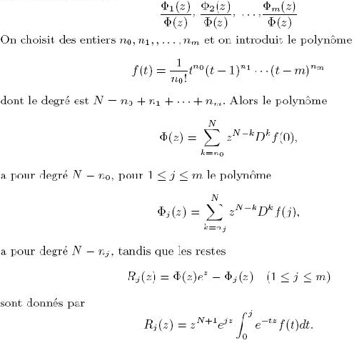 Ainsi, une étape essentielle de la démonstration d'Hermite consiste à expliciter des fractions rationnelles, ayant le même dénominateur, qui approchent les fonctions exponentielles. On veux approcher simultanément les fonctions ez, e2z, ...., emz par des fractions rationnelles
