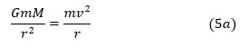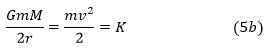 Quand la Lune prend une orbite plus large (r augmente), le terme de gauche de (5b) décroît, et donc la vitesse v dans le terme central aussi, avec l’énergie cinétique K. Ceci est conforme à la 3e loi de Kepler suivant laquelle plus la planète (ou le satellite) est éloignée du centre de rotation (que celui-ci soit le Soleil ou la Terre), le moins vite elle tourne.
