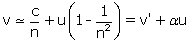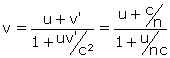 ce qui revient à formule classique (non relativiste) d’addition des deux vitesses v’ et αu. Cette dernière valeur correspond, dans la théorie de l’éther, à l’entraînement partiel de l’éther par l’eau en mouvement à la vitesse u dans le tube : on retrouve ainsi en ce bas d’encadré (calcul relativiste au premier ordre) la formule de bas du premier encadré (calcul classique).