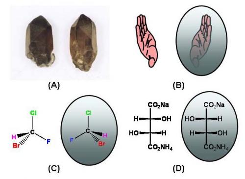 Figure 3. Les objets chiraux et leurs images spéculaires. (A) Cristaux hémièdres (ou plagièdres) du quartz. (B) L’image spéculaire d’une main gauche est la main droite. L’’origine du terme « chiral » est le terme grec « kheir », signifiant « main ». (C) Un exemple de molécule (le bromochlorofluorométhane) possédant un carbone asymétrique. Les liaisons C-H et C-Br sont dirigées vers l’arrière ou vers l’avant selon qu’elles sont respectivement en pointillés ou en gras. (D) Le tartrate double chiral de sodium et d’ammonium et son image dans le miroir.