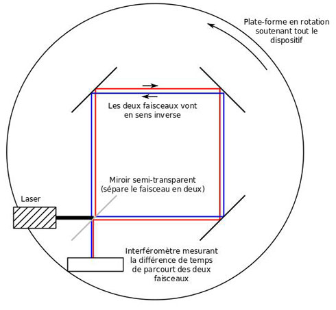 Les conditions sont ici clairement posées : on fait parcourir à deux signaux lumineux un circuit fermé identique mais en sens inverse dont on observe les interférences à leur point de rencontre (le récepteur étant une plaque photographique qui enregistre les franges d’interférence). Le schéma détaillé de ce circuit fermé est fourni dans la deuxième note.