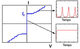 Figure 7 : Jonction Josephson (à gauche) et sa caractéristique courant-tension (à droite). À tension nulle, l’intensité est constante (graphique en bas à droite). À tension constante non nulle, l'intensité oscille à une fréquence proportionnelle à cette tension (graphique en haut à droite) (images LNE).
