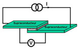 (20) Dans un supraconducteur, les électrons libres, en s'appariant, subissent une condensation de Bose-Einstein similaire à celle des photons de la lumière laser et se trouvent ainsi dans un même état quantique. Le courant qui traverse la jonction Josephson résulte de l'interférence des deux états quantiques des électrons qui se trouvent dans les deux supraconducteurs qui forment la jonction.