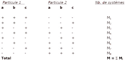 Cherchons à simplifier l’article de Bell en donnant un exemple simple d’application d’inégalité de Bell, avec des particules de spin ½. Soient deux particules 1 & 2, qui forment une paire EPR se propageant dans des directions contraires et dont on mesure les corrélations de spin suivant trois axes situés dans le plan des détecteurs, les axes a, b et c. S’il existait un paramètre caché, suivant sa valeur les paires EPR se diviseraient en huit classes :