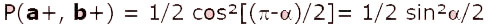 Comme les deux particules sont intriquées, si la particule 2 se trouve dans l'état b+ alors la particule 1 se trouve dans l'état b-. Calculer la probabilité P(a+, b+) équivaut donc à déterminer la probabilité de mesurer dans l'état b- la particule 1, initialement dans l'état a+ ; d’après la théorie quantique, cette probabilité est proportionnelle au cosinus carré de la moitié de l’angle formé par a+ et b- (demi-droite opposée à celle représentée sur la figure en b) :