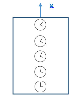 Accrochons du plancher jusqu’au plafond des horloges supposées parfaites au rythme identique et idéalement synchronisées. Ces horloges sont donc espacées verticalement d’une distance fixe. Dans l’ascenseur « immobile », ces horloges parfaites resteront synchronisées conformément à la relativité restreinte.