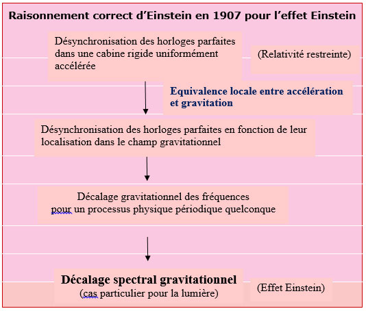 Bien sûr, la dérivation rigoureuse[8] de l’effet Einstein passe par la relativité générale (qui n’existait ni en 1907 ni en 1911). Toutefois elle est assez proche du raisonnement déjà formulé par Einstein en 1907.