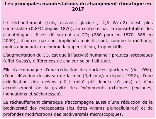 Le réchauffement (sols, océans, glaciers ; 2,3 W/m2) n’est plus contestable (0,8°C depuis 1870), ni contesté par la quasi-totalité des climatologues. Il est dû surtout au CO2 (280 ppm en 1870, 388 en 2009) ; d’autres gaz sont impliqués mais ils sont, comme le méthane, moins abondants ou comme la vapeur d’eau, trop volatils.