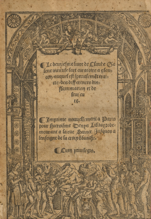 Selon une notice biographique du catalogue de la Bibliothèque nationale de France, la période d’activité de Jérôme Denis se situerait entre 1527 et 1534. S’il fut « condamné au bûcher comme hérétique lors de l’affaire des Placards en octobre-décembre 1534 », « il est possible qu’il n’ait pas été supplicié22 ». Une seconde notice biographique de la BnF – qui n’est malheureusement pas mise en rapport avec la précédente – nous apprend que Denis s’établit en 1529 à l’adresse de l’imprimeur-parisien Guillaume Du Puis, décédé avant cette date23. Une inscription figurant à la page de titre du Deuziesme livre de Claude Galene intitulé l’art curatoire à glaucon, sous les personnages de Clio et de Terpsichore, peut se lire « XXVI » ou « DXXVI », mais ne peut renvoyer à 1526.