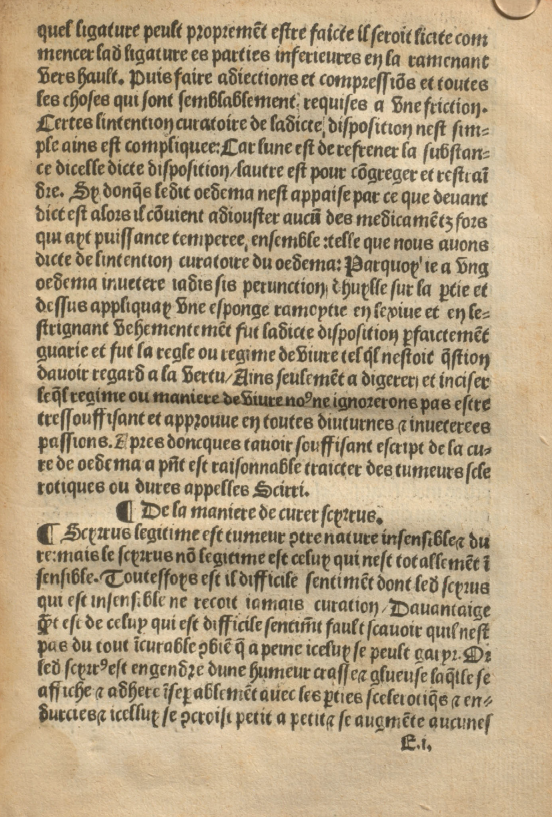 OL, p. Ei r°, l. 23-28 : Scyrrus legitime est tumeur c nature insensible & dure : mais le scyrrus nõ legitime est celuy qui nest totallemẽt insensible. Touteffoys est il difficile sentimẽt dont led scyrus qui est insensible ne recoit imais curation. Davantaige qt est de celuy qui est difficile sentiṁt fault scavoir quil nest pas du tout ĩcurable, biẽ q a peine iceluy se peult gairi.