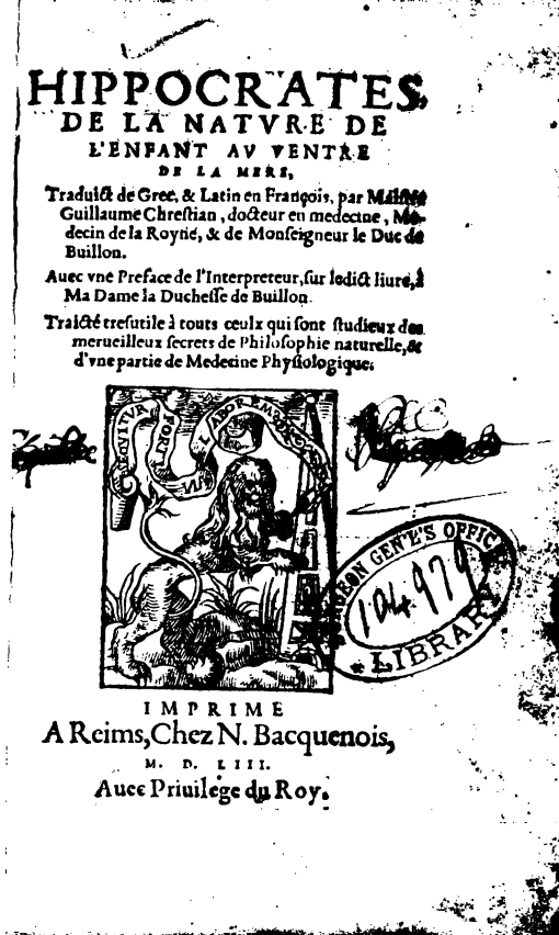 38. Hippocrates de la nature de l’enfant au ventre de la mere, traduict de Grec, & Latin en François, par Maistre Guillaume Chrestian (Reims : Chez N. Bacquenois, 1553).