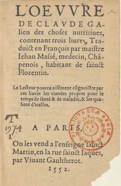 Tout paraît donc indiquer, comme le suggèrent Kemp et Véronique Boudon-Millot, que le volume parut aux environs de 1530. Denis était à l’époque intéressé par l’édition médicale puisqu’il publie cette année-là le De morbis et symptomatis, libri sex de Galien24. V. Boudon-Millot conclut que cette datation, « si elle est exacte (le colophon qui devait contenir la date d’impression a disparu), remettrait en cause l’antériorité de l’imprimerie lyonnaise pour les traductions françaises de Galien », dans la mesure où « la traduction française du livre IV du De methodo medendi par Jean Canape, parue à Lyon chez F. Juste en 1537, a longtemps été considérée comme la plus ancienne traduction galénique en langue française 25 ».