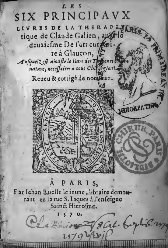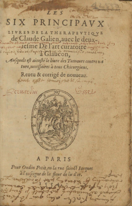 Posée par Kemp, la question de l’identité du traducteur de l’OL peut s’éclairer par les traductions contenues dans trois autres ouvrages parus après 1550. Tous se présentent sous le titre suivant : Les six principaux livres de la Thérapeutique de Claude Galien, avec le deuxiesme De l’art curatoire à Glaucon. Ils parurent respectivement en 1554, 1558 et 1570 aux adresses d’Oudin Petit à Paris, de Thibauld Payen ou Payan à Lyon et de Jean Ruelle le jeune à Paris80.