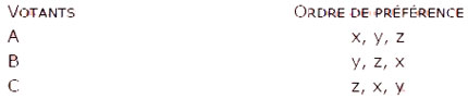 Imaginons qu'un comité de sélection composé de trois personnes A, B, et C, ait à choisir un candidat parmi trois postulants x, y, et z. Les choix de chacun sont ordonnés et sont les suivants :