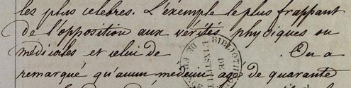 On distingue nettement deux documents : un brouillon sur papier parchemin et une mise au propre sur papier oignon, de plus petit format. On peut raisonnablement penser que le deuxième document est une copie ultérieure (faite après la mort de Condorcet, au moment de la réédition de certains de ses textes ?), car le copiste ne réussit pas à lire dans le manuscrit le nom de Harvey, très mal écrit (cf. ci-dessous le blanc laissé, sous le tampon) — si ç’avait été Condorcet l’auteur du second document, il n’y aurait bien sûr pas eu cette lacune.