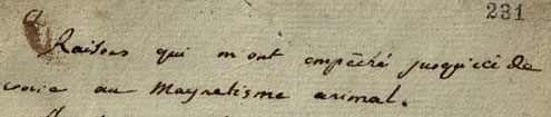 « Sur les raisons qui m’ont empêché jusqu’ici de croire au magnétisme animal », manuscrit MS 883 de la Bibliothèque de l’Institut, folios 230-246 (plus deux feuillets non numérotés). Ce manuscrit inédit de Condorcet y est assemblé avec ce qui est sans doute une copie ultérieure, de main inconnue.