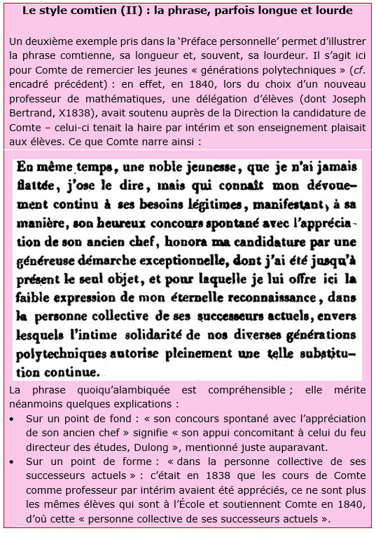 La ‘Préface personnelle’ de 1842 est un modèle du mélange des genres entre un discours qui expose une doctrine philosophico-scientifique (celle de la philosophie positive, dans le corps de ce dernier tome, précédé par les cinq tomes précédents) et un discours centré sur l’auteur – ici les vicissitudes de Comte mises en scène et analysées à l’aune de sa théorie philosophique, qui en premier lieu s’applique à sa propre vie[22].