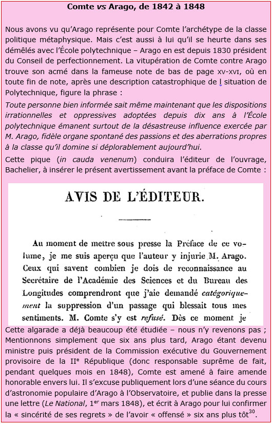 Toute personne bien informée sait même maintenant que les dispositions irrationnelles et oppressives adoptées depuis dix ans à l’École polytechnique émanent surtout de la désastreuse influence exercée par M. Arago, fidèle organe spontané des passions et des aberrations propres à la classe qu’il domine si déplorablement aujourd’hui[28].