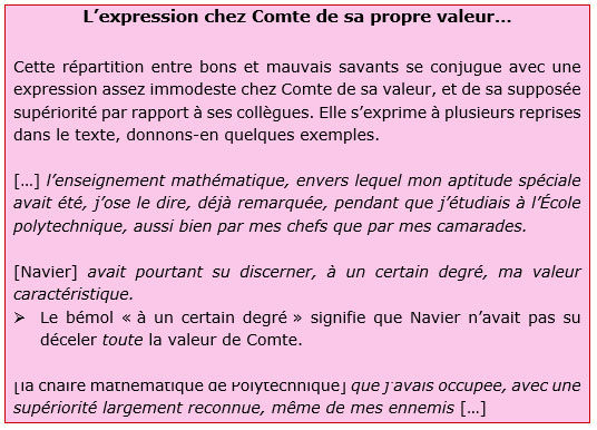 De manière corollaire, Comte distingue en permanence les bons savants des mauvais. Les premiers sont ceux dont il estime la méthode conforme à l’approche positive. Il se trouve que ce sont souvent aussi, plus prosaïquement, ceux qui l’ont aidé dans sa carrière, comme les mathématiciens Poinsot et Navier. Malgré le fier service que ce dernier lui avait rendu en lui offrant une place de répétiteur de son cours à Polytechnique en 1832, il est égratigné de manière quelque peu fielleuse :