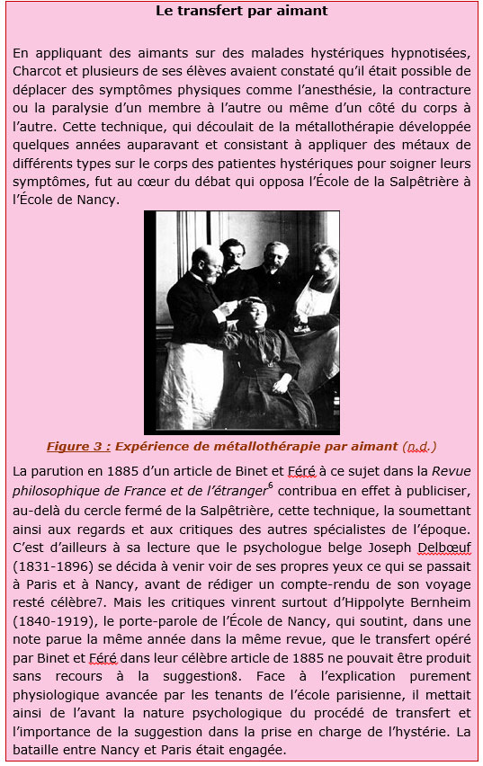 [5]. L’École de Nancy voyait dans l'hypnose un simple sommeil produit par la suggestion et susceptible d'applications thérapeutiques variées, alors que celle de la Salpêtrière considérait que l'hypnose est un état pathologique spécifique propre aux hystériques et permettant donc d’étudier cette pathologie. Bernheim, chef de file de l’École de Nancy, pensait que les effets de l’hypnose pouvaient tout aussi bien être obtenus à l'état de veille par la suggestion, selon une méthode qu'il désigna alors du nom de « psychothérapie ». À ce sujet, voir Serge Nicolas, 2004.