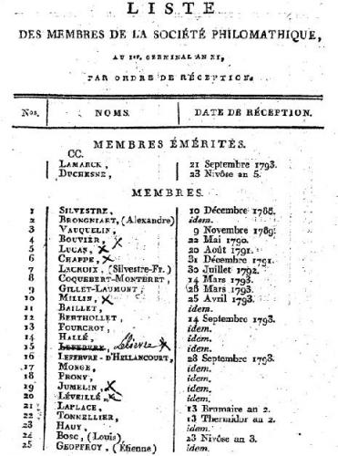 Figure 2 : Liste des vingt-cinq premiers membres au 1er germinal an XI (mars 1803). On reconnaît, en position 1 & 2, les noms des fondateurs au 10 décembre 1788, Augustin-François Silvestre et Alexandre Brongniart.