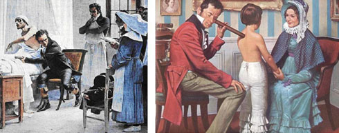 Figure 4 (à g.) "Laënnec à l'hôpital Necker ausculte un phtisique devant ses élèves (1816)". Peinture commémorative ultérieure de Théobald Chartran (1849-1907), Grand escalier de la Sorbonne ; on reconnaît le stéthoscope dans la main gauche de Laennec (à dr.) "Laënnec et le stéthoscope" Peinture (ca. 1960) de Robert A. Thom (1915-1979).