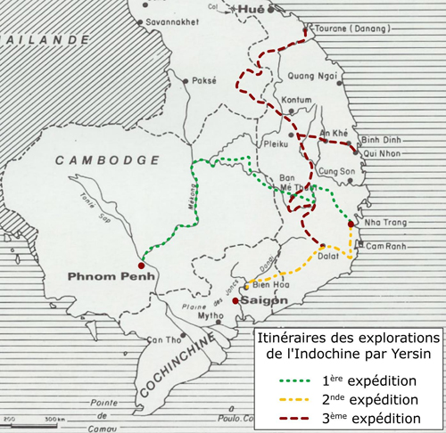 Figure 3 : Carte retraçant les itinéraires des trois expéditions d’exploration du sud de l’Indochine par Alexandre Yersin.