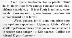 Malheureusement, les préjugés ont la vie longue. Dans un contexte de lutte ouverte entre les valeurs cléricales et les valeurs laïques, moyennant une candeur parfois feinte, les idées de Poincaré pouvaient devenir une formidable arme idéologique. Ainsi, dans Le Matin du 20 février 1908, un théologien, Monseigneur Bolo, ironisera sur la science et la philosophie « laïques » en nommant notre homme de science : "Poincaré, qui est le plus grand mathématicien du siècle, donne tort à l’obstination de Galilée.